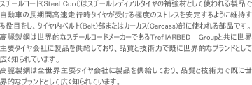 物理的特性値Filament, Strand, Cord, Wrap, Lay, Diameter of Cord, Linear Density, Straightness, Flare, Residual Torsions 機械的特性値Tensile Strength, Breaking load, Breaking elongation, Low load elongation, Stiffness - elasticity, Adhesion strength, Appearance |
